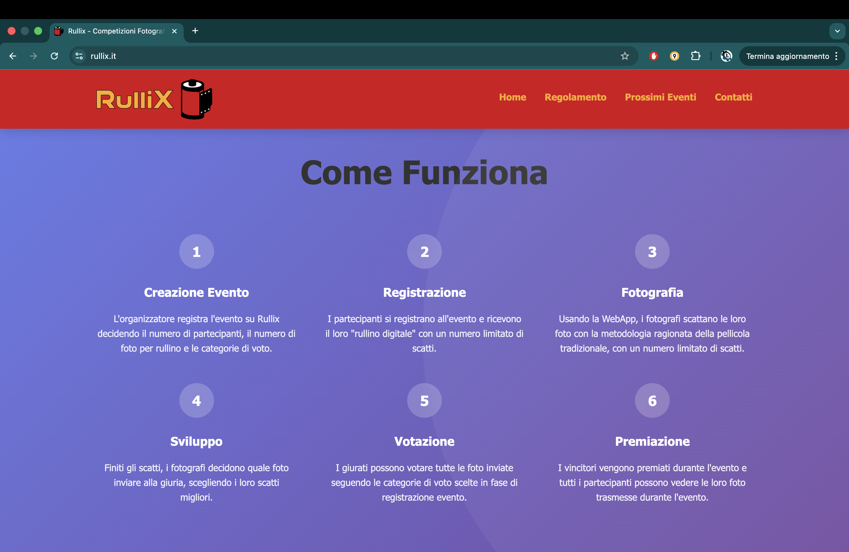 Ho sviluppato un'app web, partendo dal portale per la registrazione dell'evento alla gestione dell'operatore e delle iscrizioni. E' presente anche la sezione gallery e la parte per la giuria