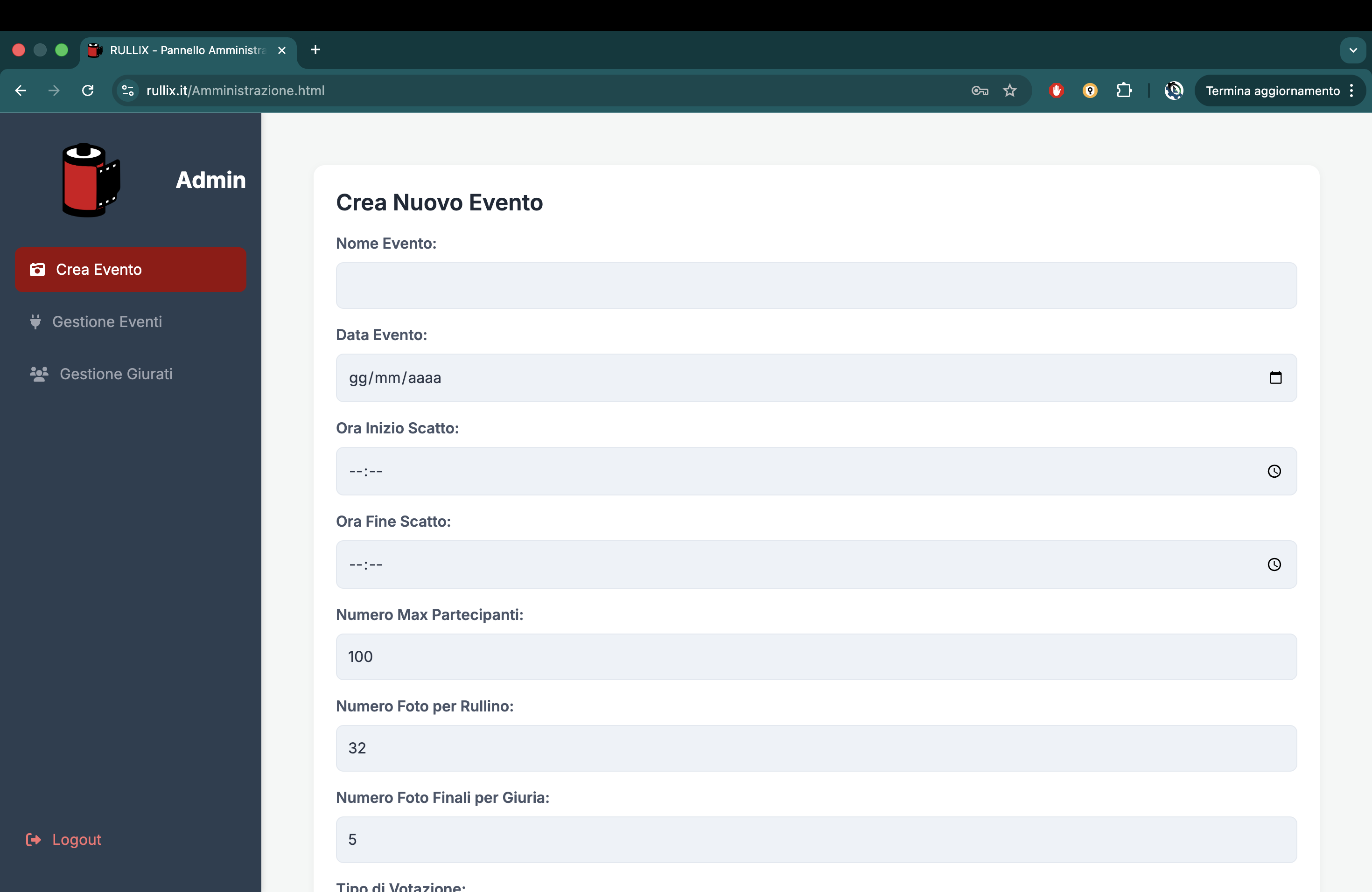 // La pagina amministrazione dove registrare un nuovo evento